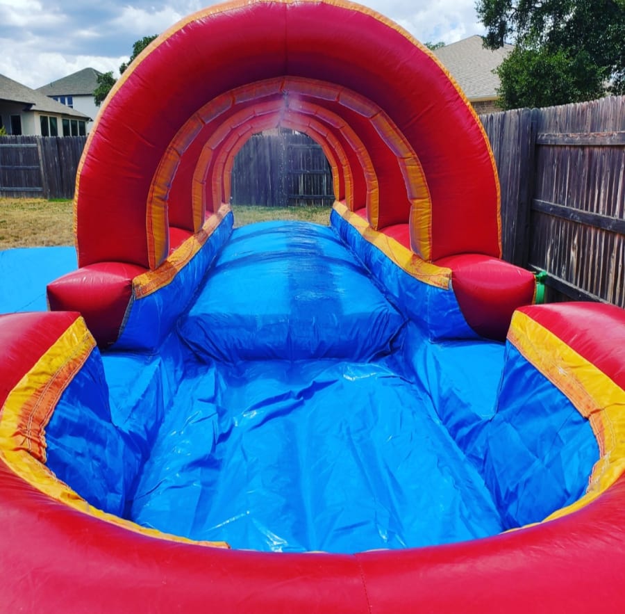 30 feet of Slip n' Slide fun! Run up to the slide and jump in as you slide down 30 feet into a huge pool while getting sprayed with water from above.