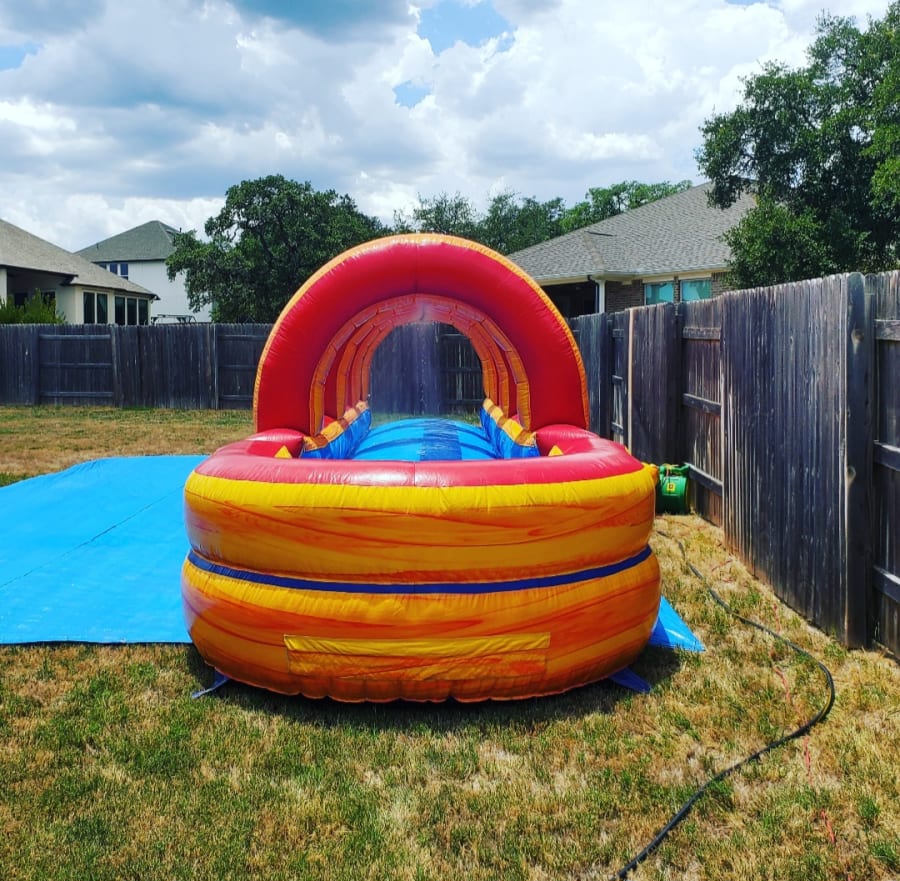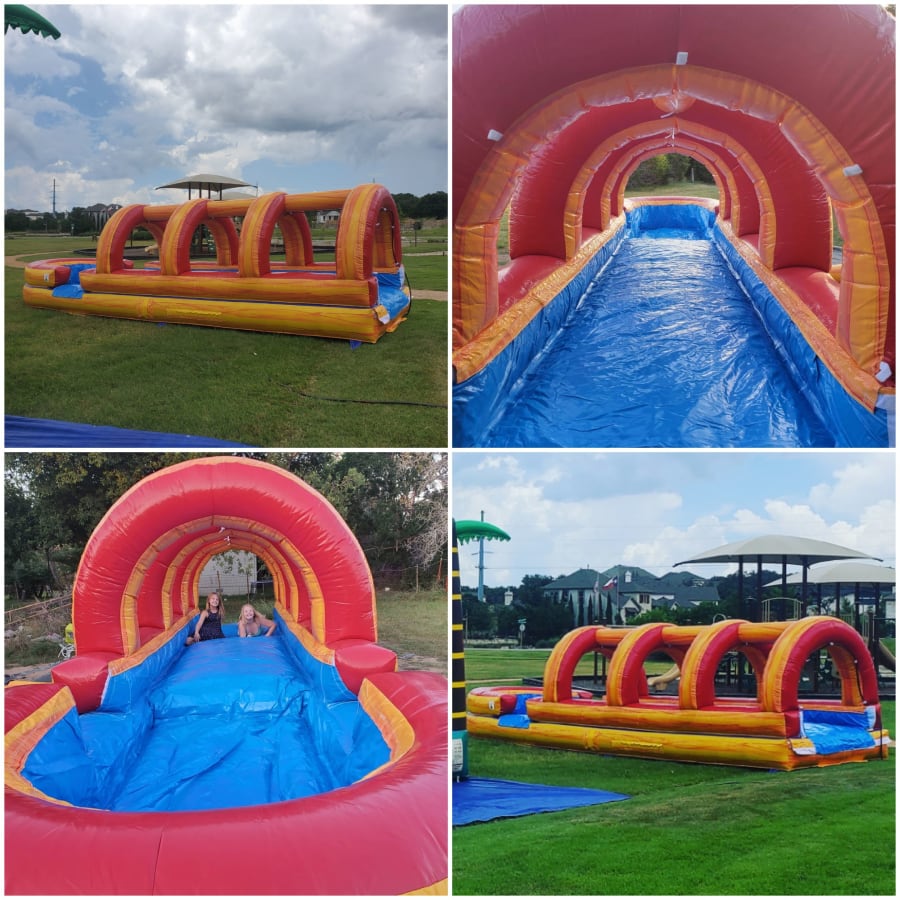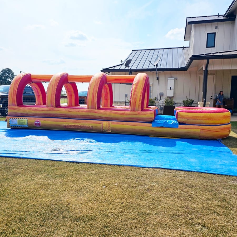 30 feet of Slip n' Slide fun! Run up to the slide and jump in as you slide down 30 feet into a huge pool while getting sprayed with water from above.