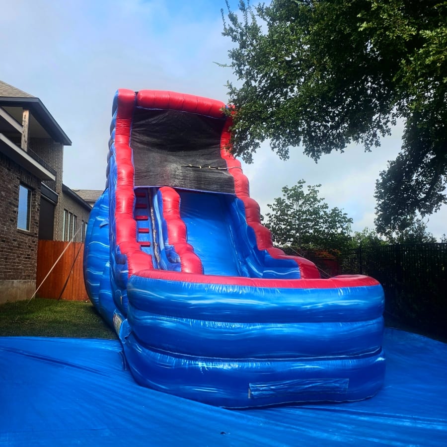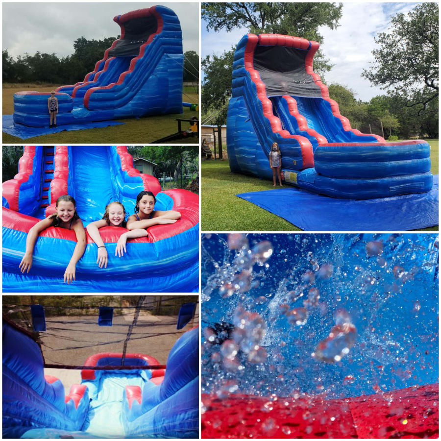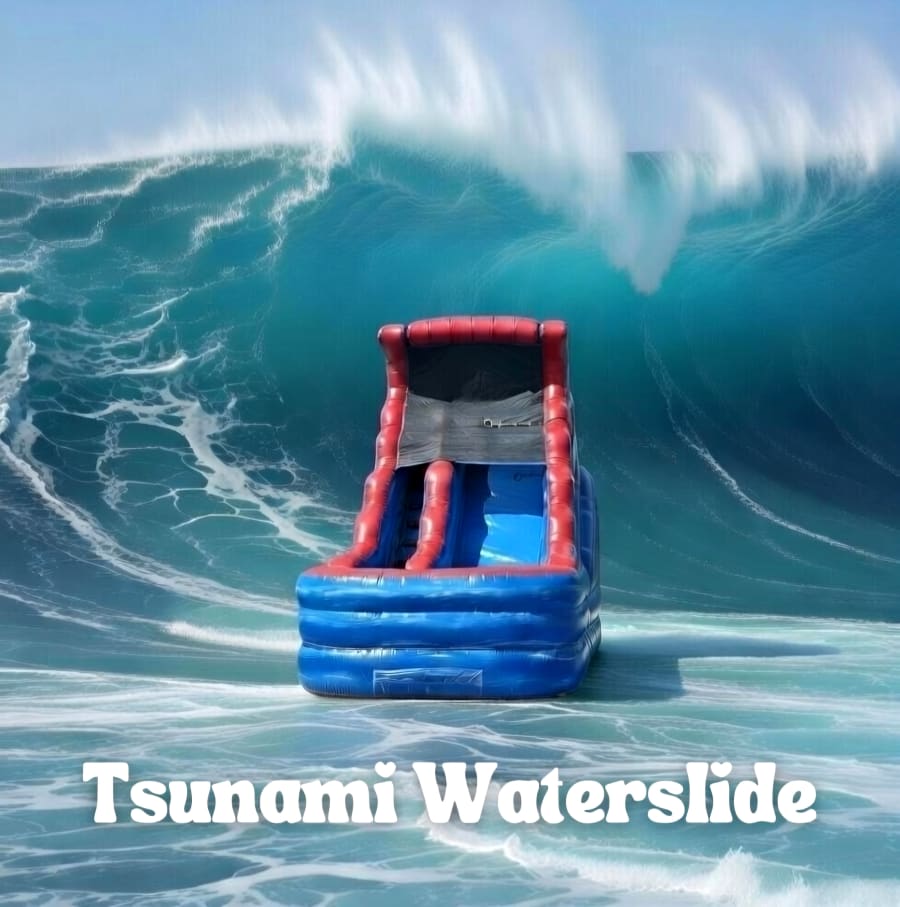 Tsunami Waterslide, 20 foot tall marble design with huge attached landing pool. Slide down as a huge wave rip curls over you as you slide down into refreshing water.