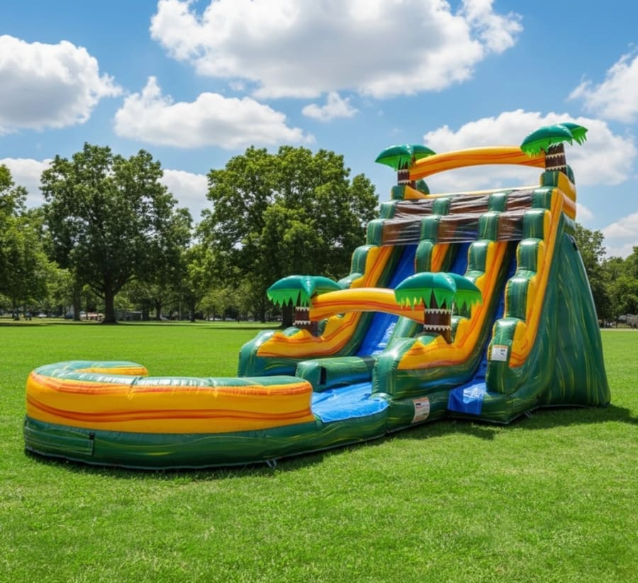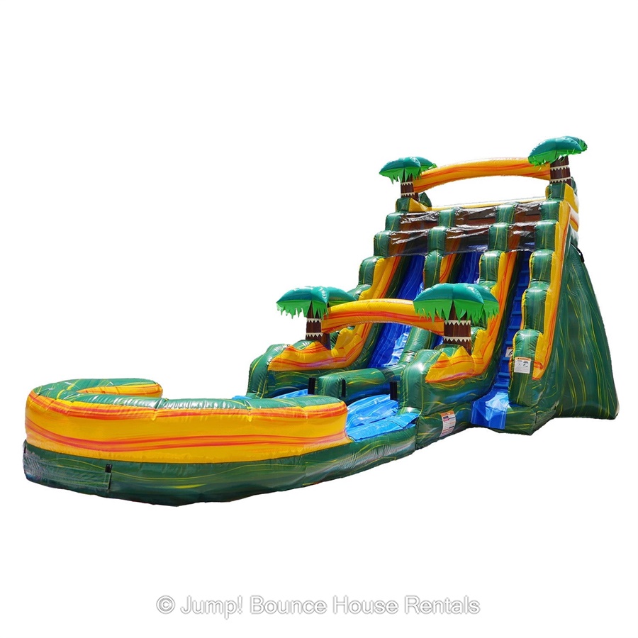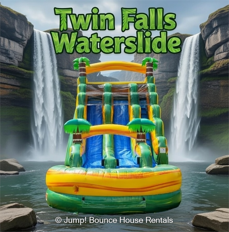 Twin Falls 22 Ft Tall Dual Lane Waterslide with massive pool. Your kids will feel like they are on an island where they've come across a huge waterfall. This unit has two lanes perfect for parties big or small.