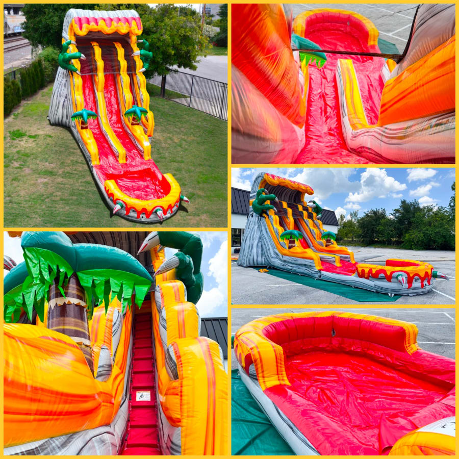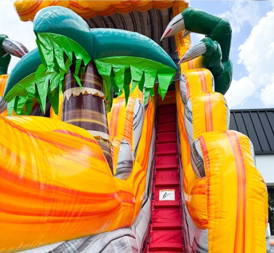 This huge slide is awesome and eye catching, every neighborhood kid is going to want to come over and give it a try. Climb up to the top and sit next to a friend in your own lane, on the count of 3 slide down at the same time escaping the clutches of the tyrannosaurus rex while landing into a massive pool filled with refreshingly cool water.