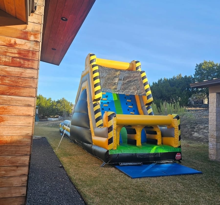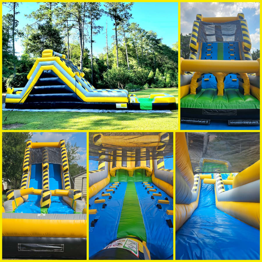 Crawl through the tunnels, climb up the back of the slide to the top using the double ladders and slide down through obstacles into a refreshing pool of water. Can be used dry or as a waterslide, book it for events and have two lines to help with less crowding. It's hazardous theme is super fun, the kids pretend to slide down into the green toxic sludge.
