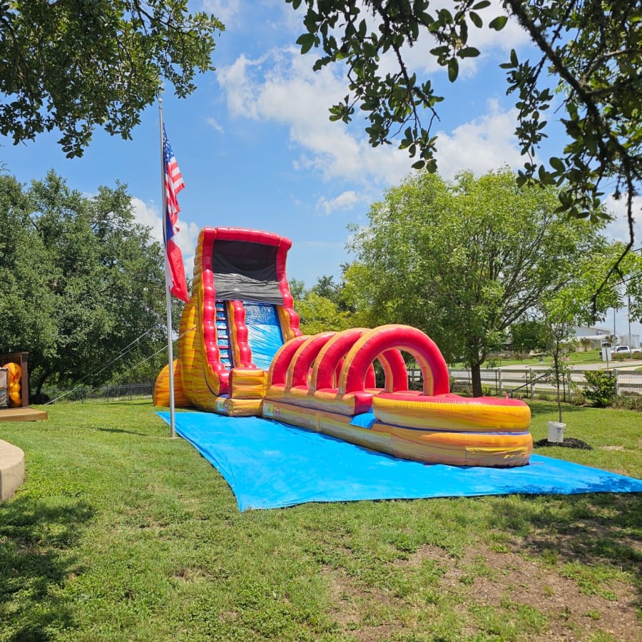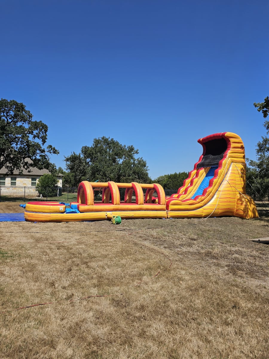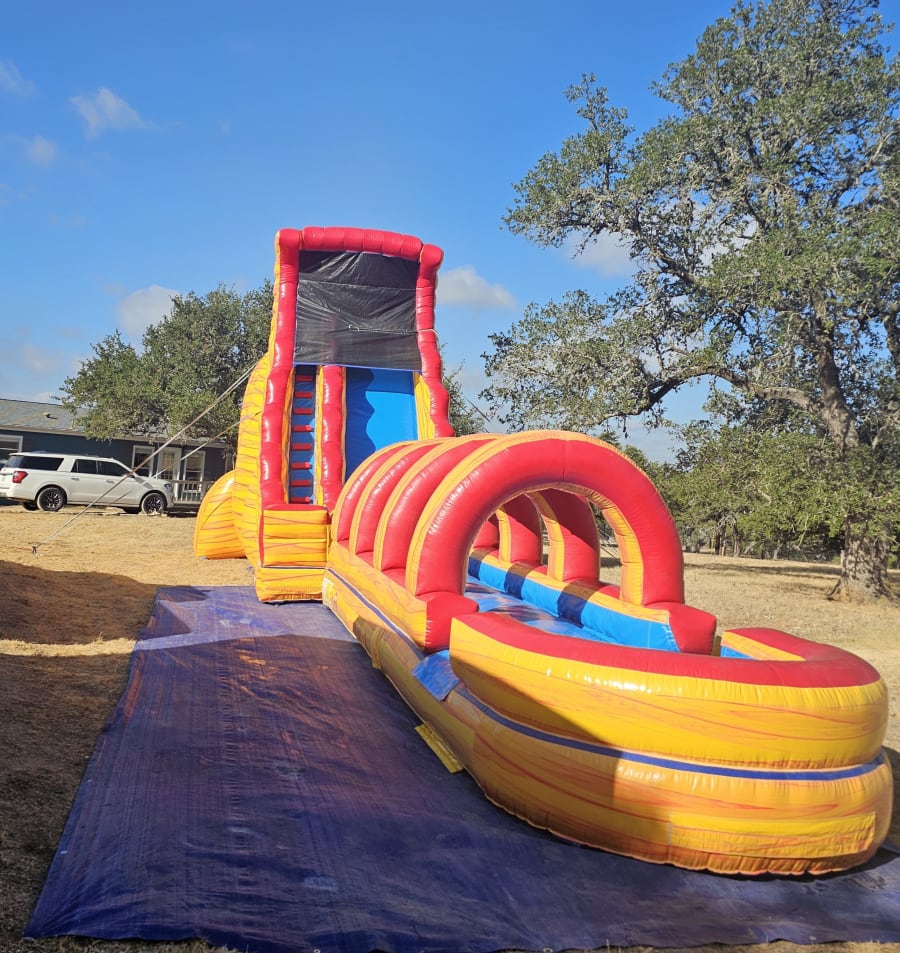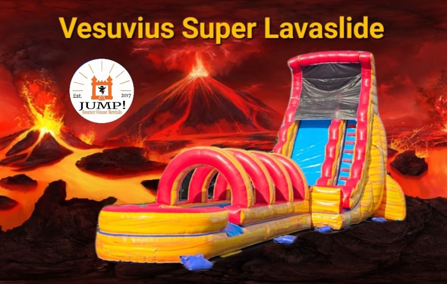 Vesuvius 22 Ft Tall Super Lavaslide. At 22 foot tall and with it's fiery marble design this unit is truly a sight to see. Water sprays down from above as you slide 25 feet across the volcano and reach the lava slip n' slide portion where you'll slide an additional 30 feet into a huge landing pool filled with water.