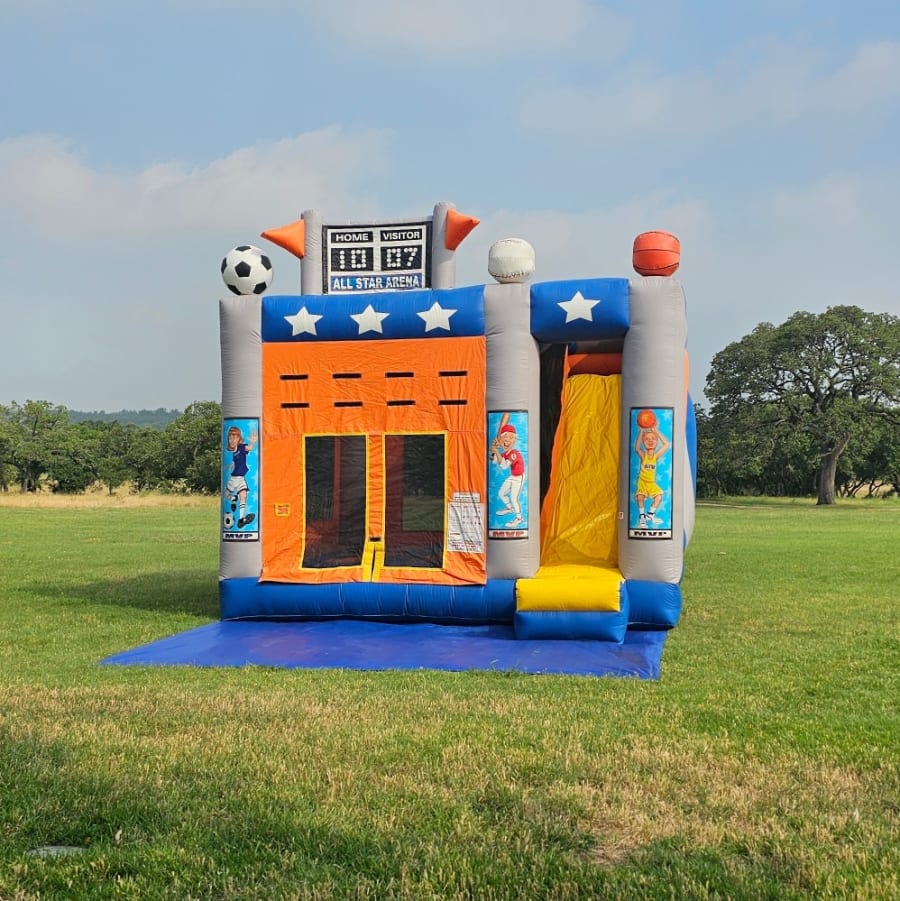 All Star Arena Side Slide Combo. Has a basketball ball hoop inside and a 13 foot tall slide with an awesome 50 degree sliding angle that even the big kids will love.