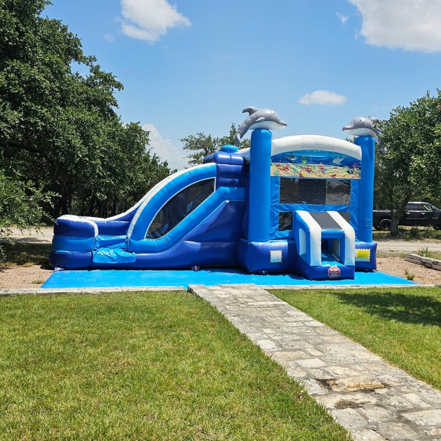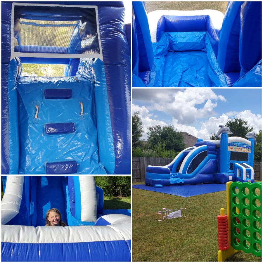Seaworld Bounce House Slide Combo. Has basketball hoop inside and fun pylons