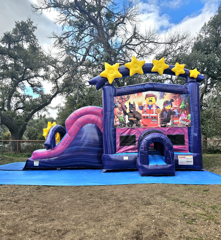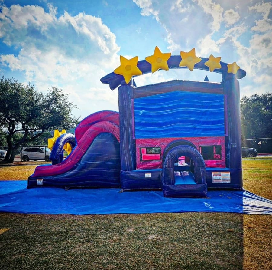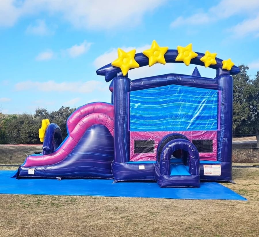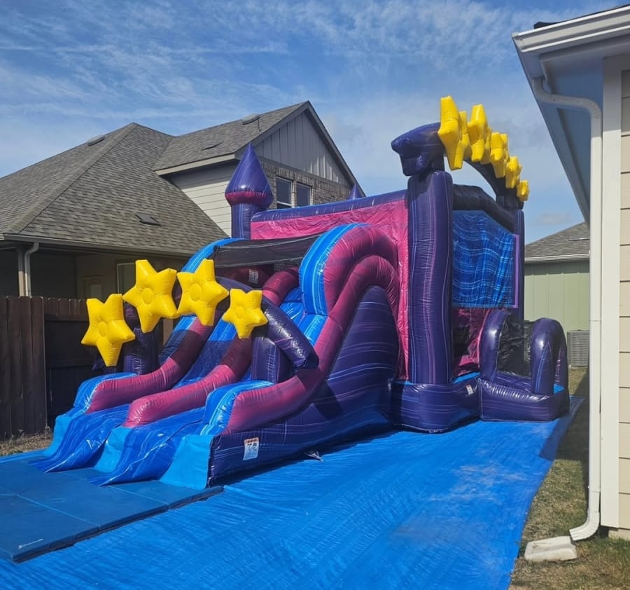 Galaxy Dual Lane Slide Combo. Has two sliding lanes perfect for racing and a theme thats out of this world. Has a huge bouncing area with ladder, basketball hoop and fun pylons inside.