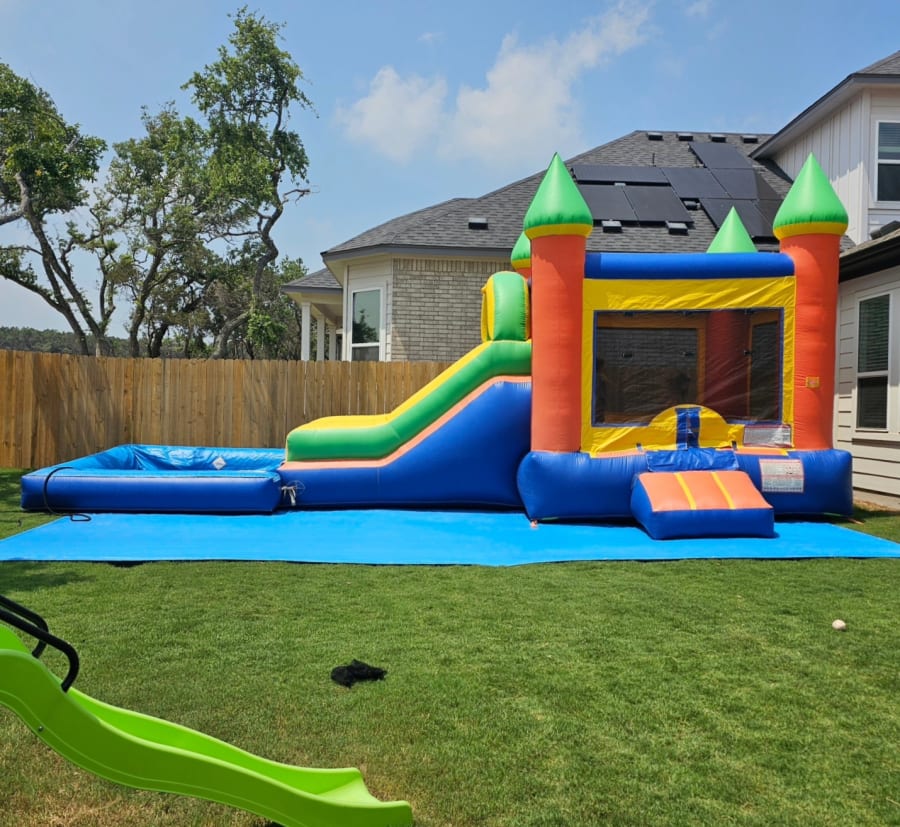 Orange Castle Waterslide Combo with massive 10x10 foot pool. This unit has bright fun colors and it is our most re-booked unit because kids absolutely love the huge pool.