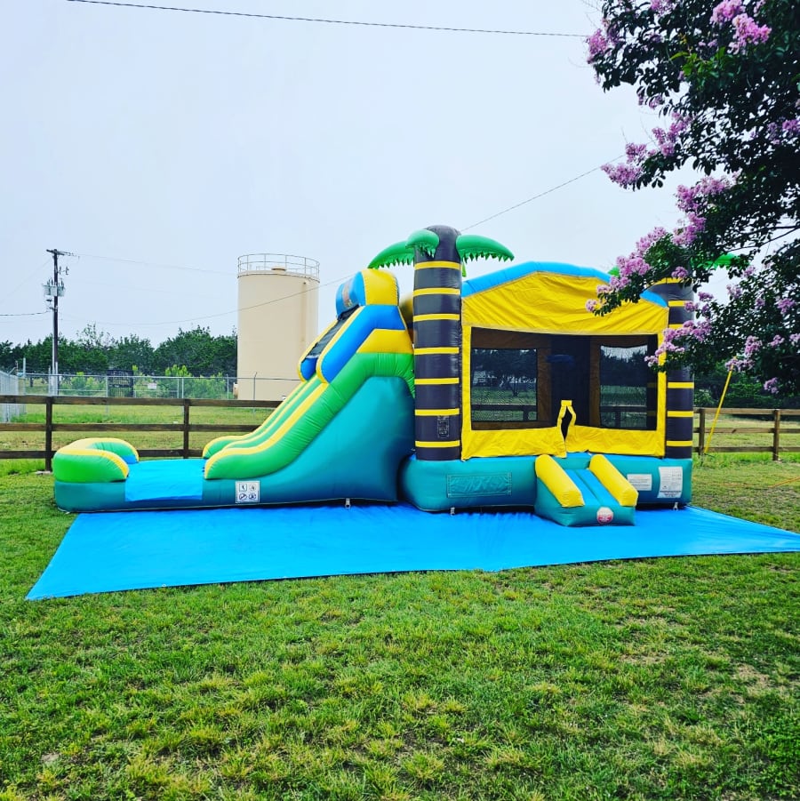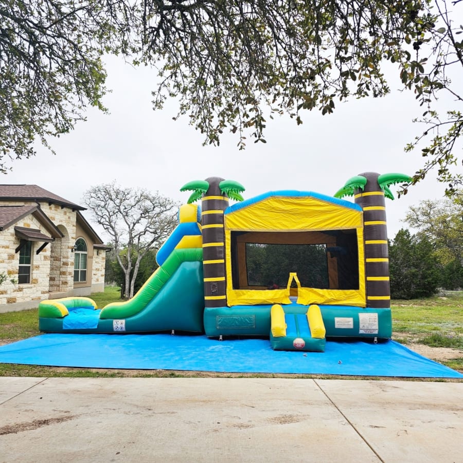Enchanted Tiki Dual Lane Waterslide Combo with splash pad (holds roughly 3 inches of water). Has climbing wall and two basketball hoops.