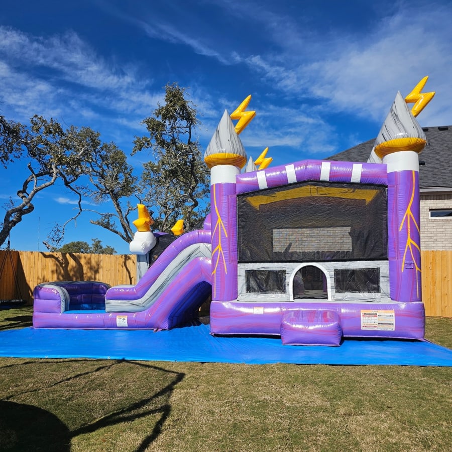 Merlin's Castle Dual Lane Waterslide Combo. Has two sliding lanes perfect for racing into a big water filled pool with awesome thunderbolts, fun pylons and a basketball hoop inside.
