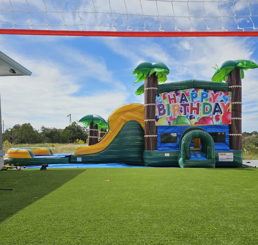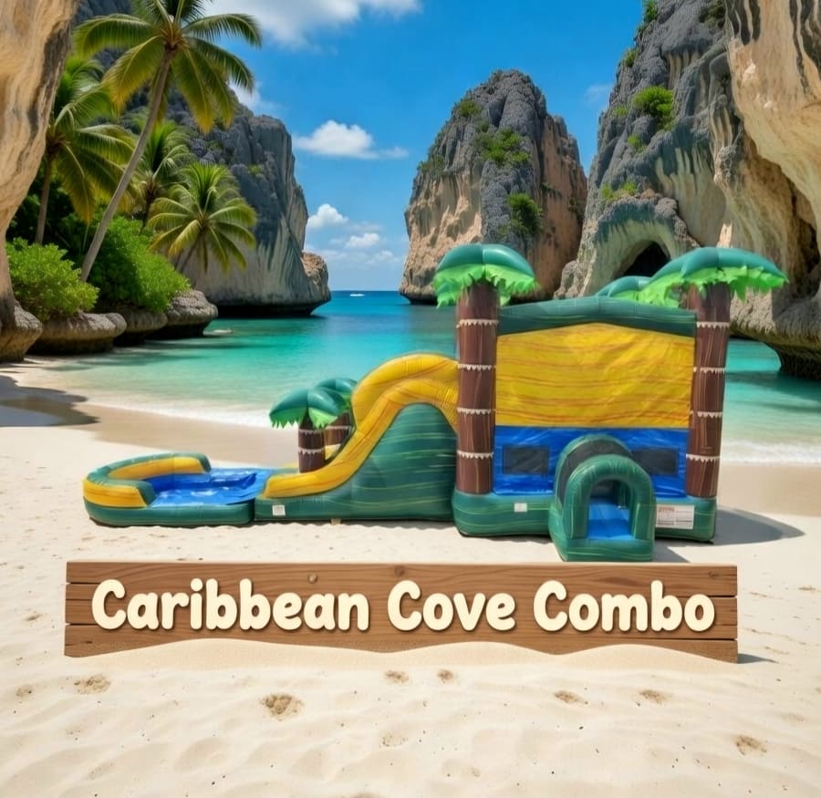 Caribbean Sunset XL Dual Lane Waterslide Combo. This combo is a massive 36 feet long! Has two sliding lanes perfect for racing into a huge pool and a beautiful sunset theme with palm trees. Has a huge bouncing area with ladder, basketball hoop and fun pylons inside.