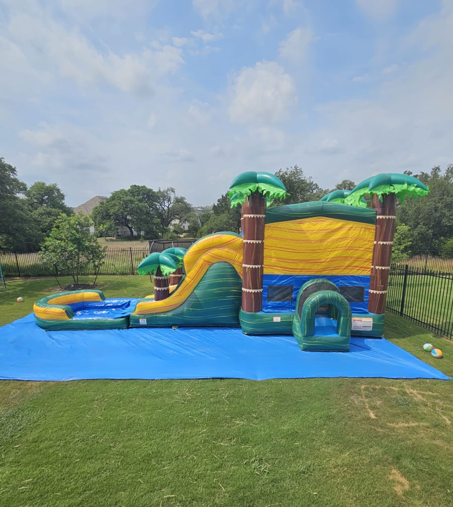 Caribbean Sunset XL Dual Lane Waterslide Combo. This combo is a massive 36 feet long! Has two sliding lanes perfect for racing into a huge pool and a beautiful sunset theme with palm trees. Has a huge bouncing area with ladder, basketball hoop and fun pylons inside.