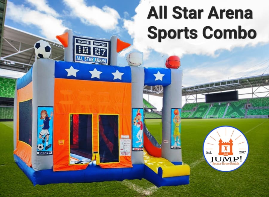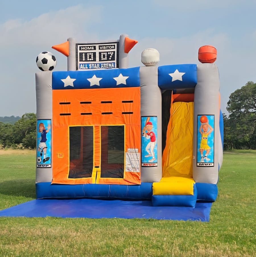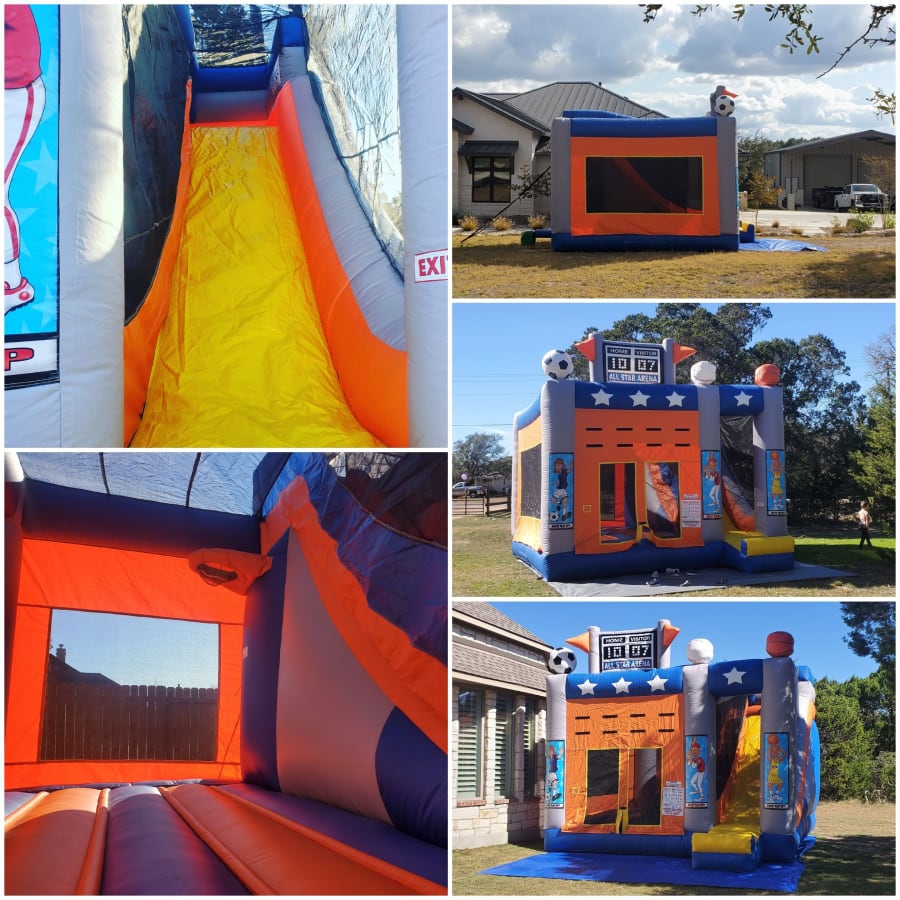 All Star Arena Side Slide Combo. Has a basketball ball hoop inside and a 13 foot tall slide with an awesome 50 degree sliding angle that even the big kids will love.