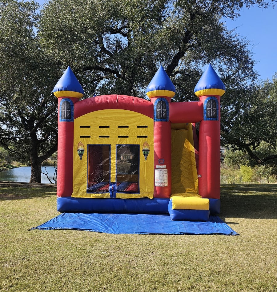 Excalibur Castle Side Slide Combo. Has a basketball ball hoop inside and a 13 foot tall slide with an awesome 50 degree sliding angle that even the big kids will love.