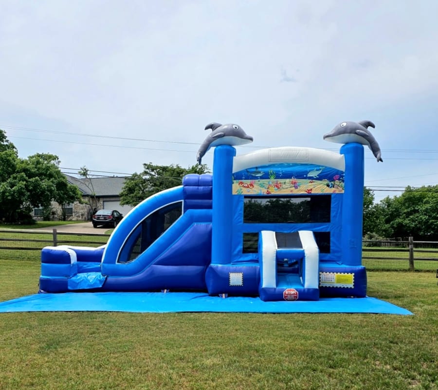 Seaworld Bounce House Slide Combo. Has basketball hoop inside and fun pylons