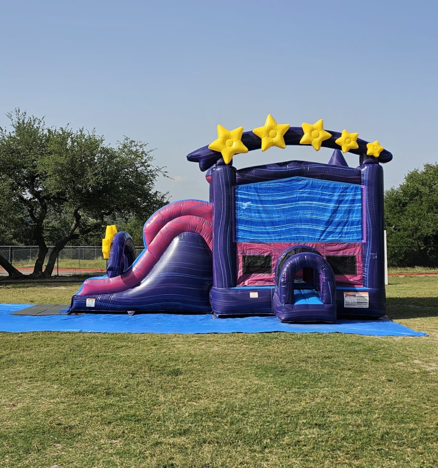 Galaxy Dual Lane Slide Combo. Has two sliding lanes perfect for racing and a theme thats out of this world. Has a huge bouncing area with ladder, basketball hoop and fun pylons inside.
