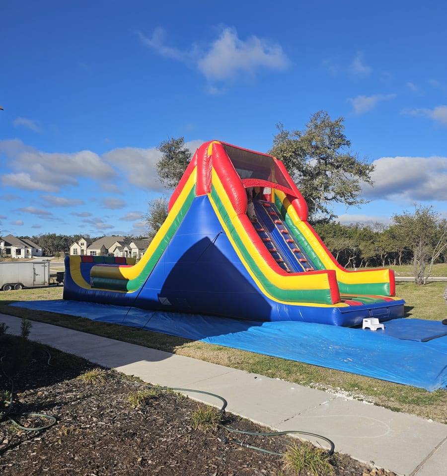 Climb up to the top with a friend using the double ladders and slide down together onto a soft landing. Can be used dry or as a waterslide, book it for events and have two lines to help with less crowding. So much fun with vibrant colors.