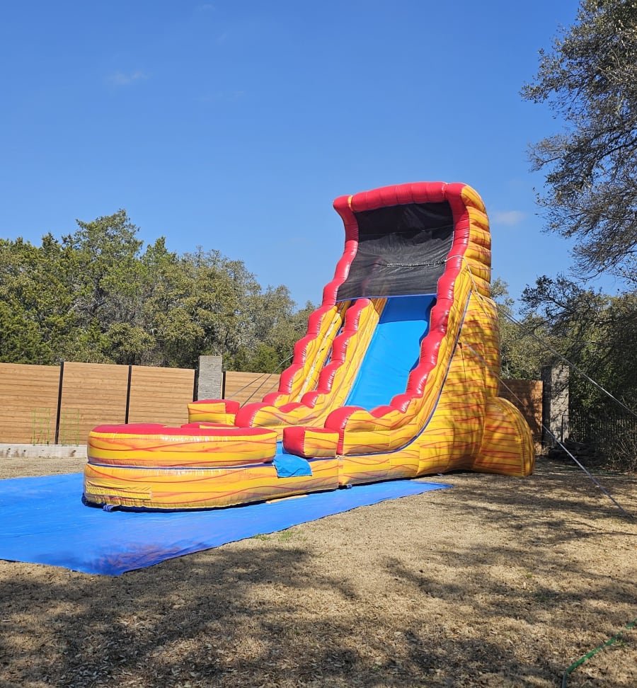 Volcano Slide. This is the dry version (no water) at 22 foot tall with fiery marble design and attached padded landing. Jump Volcano has erupted and lava is spewing down from all sides, the only safe way out is to slide down to safety.