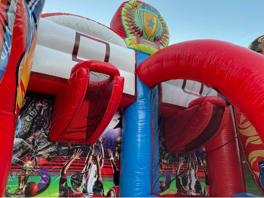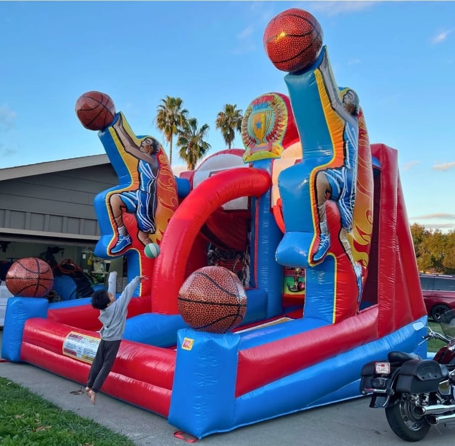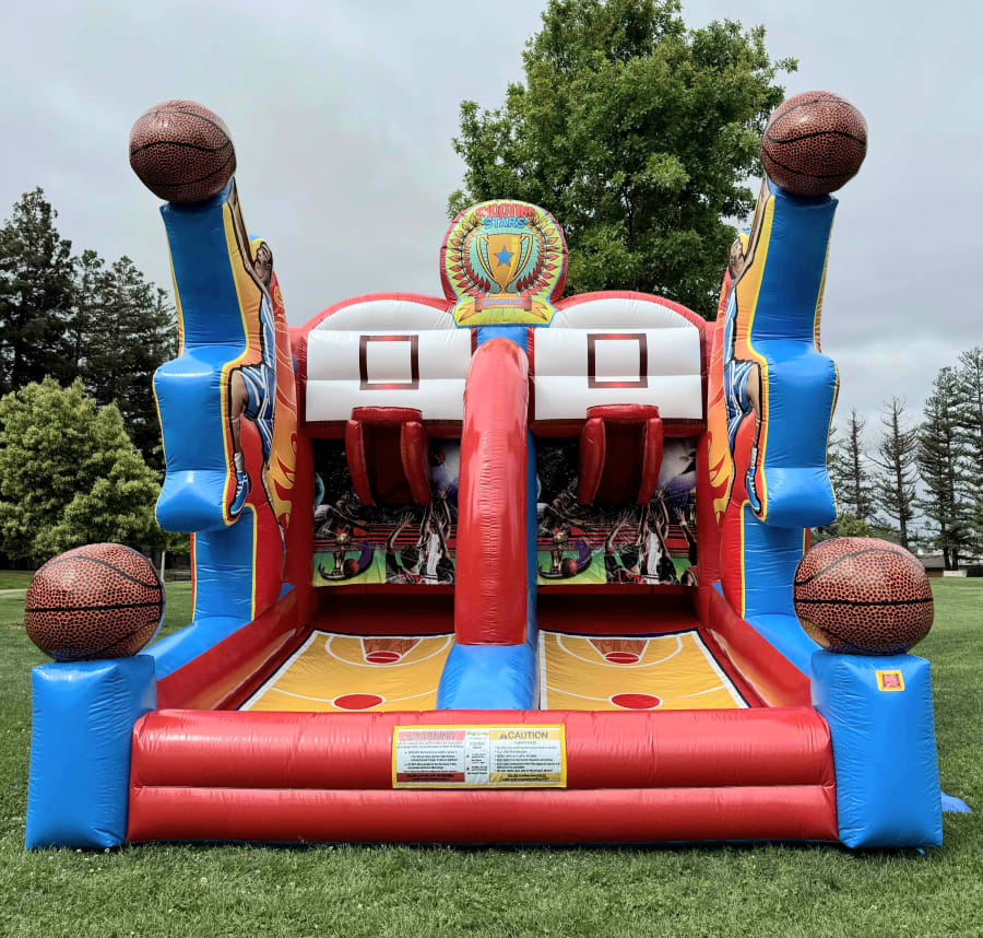 This interactive inflatable is an awesome addition to any event or party. Two players shoot basketballs and when you make the basket the balls ends up in the other players court. Winner is the first to get rid of all your basketballs, basketballs are included.