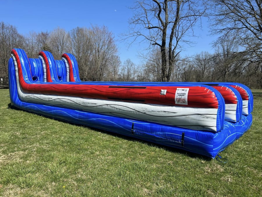 A crowd favorite, especially with older kids and adults. Two racers go head-to-head to see who can place a velcro marker the furthest down the lane before being pulled back by the bungee harnesses. [8Hx12Wx32L]ft
