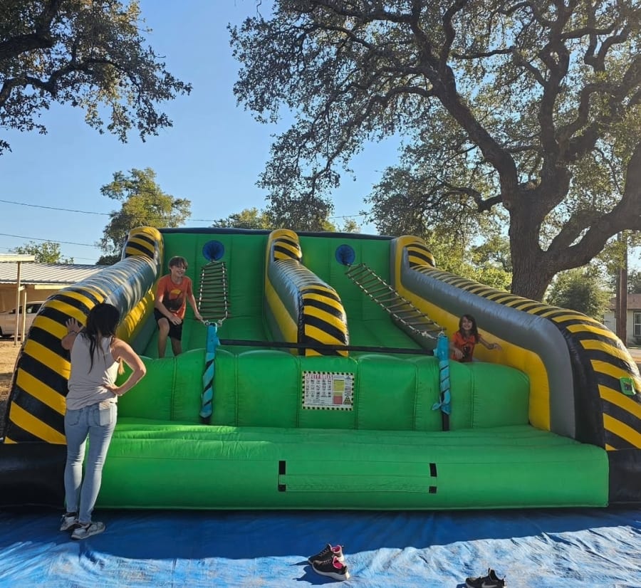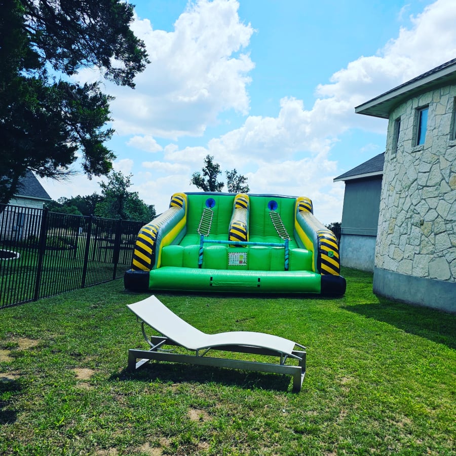 This interactive inflatable will be the hit of every event or party. Toxic sludge is pouring towards you and your only hope is to crawl across the jacob's ladder to safety on the other side. If you fall you land into the toxic bed below.