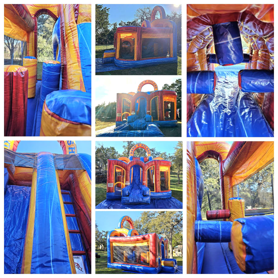 We will need an electrical outlet within 100 feet of setup to plug in our extension cord for the blower, no exceptions, if further away it could cause the outlet to overheat and trip your breaker. If you do not have an outlet that close you will need to provide a generator or you can rent one from us, they are located in the Party Extras tab. Area must be cleaned BEFORE we arrive of all animal droppings/waste, sticks, sharp rocks, litter, trash or anything that could possibly puncture the unit or cause harm to the children. If needing to go through a small space or through a gate it will need to be at least 4 feet wide or the unit will not fit through the space.