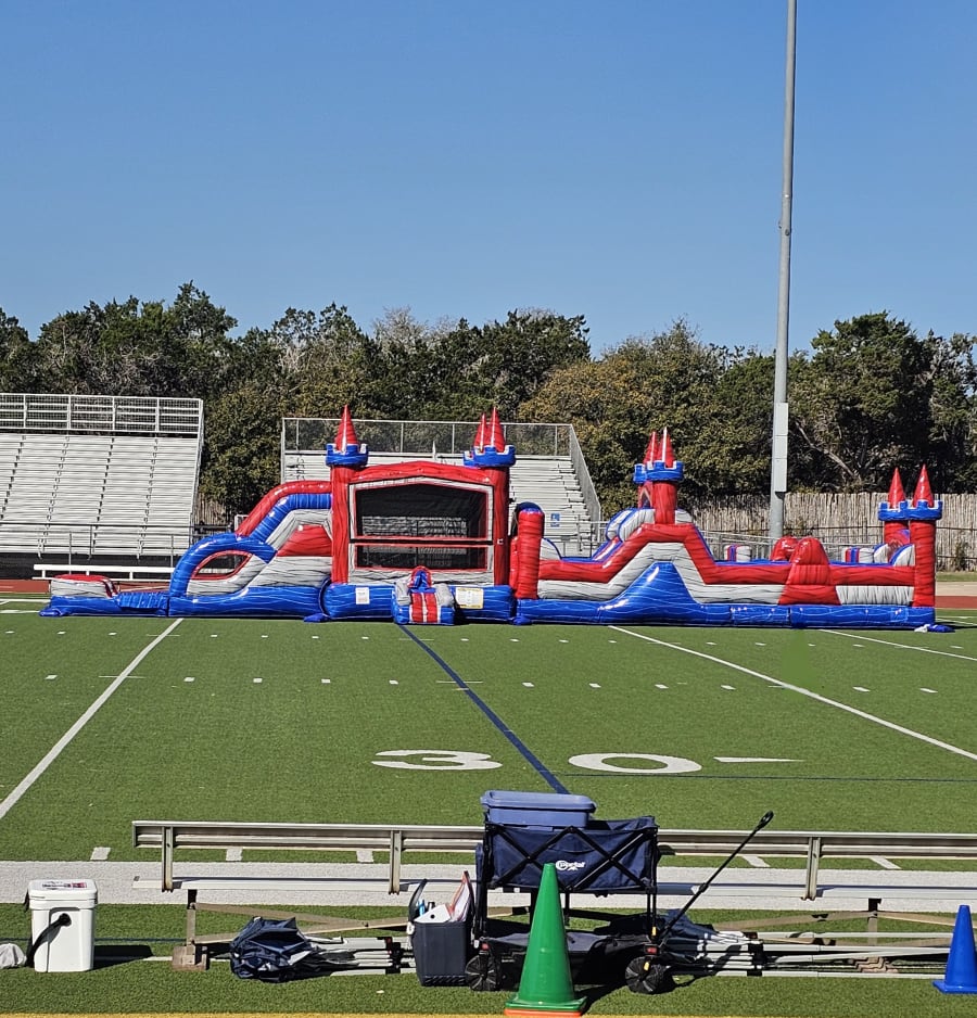 Go head to head with your friends and find out who can make it through all obstacles the fastest! An amazing 65 feet long of crawling, running, jumping, climbing, sliding and more! The perfect addition to any party or event, can be used dry or as a waterslide with dual sliding lanes. It also has a full sized bounce house area with basketball hoop inside for gaurenteed hours of entertainment.