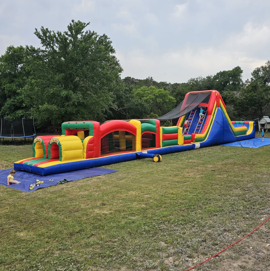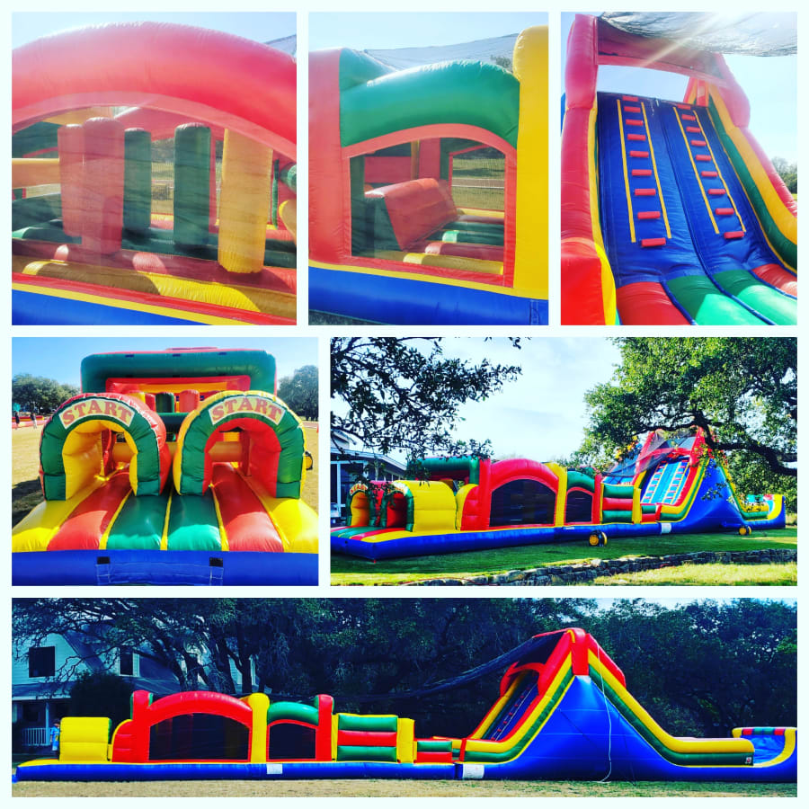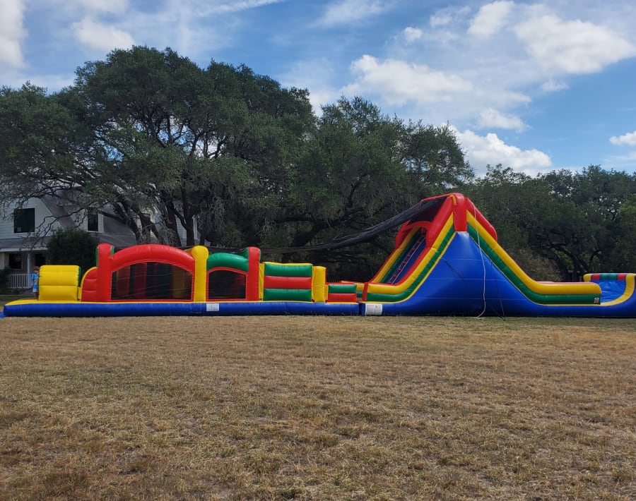 This obstacle course is huge! Run, climb, crawl, squeeze and slide through 80 feet of obstacles that will be the hit of any event! Race a friend to see who can make it through the fastest! This unit can be used dry or as a waterslide with an awesome splash landing at the finish line.