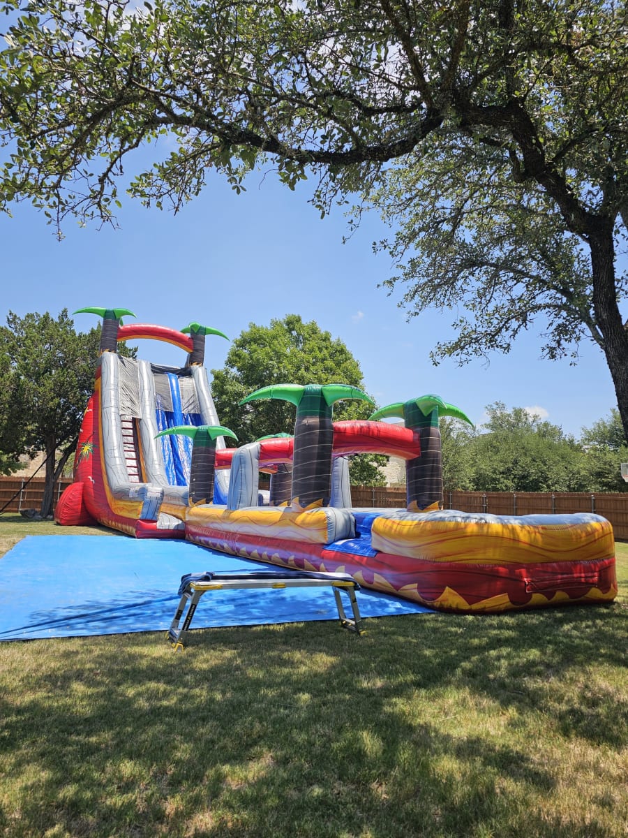 This is our biggest waterslide yet, at a whopping 28 feet tall and 68 feet long it is an absolute beast! This unit will ensure your kids have the best party ever! It has two sliding lanes so your guests can race head to head flying down onto the connected slip n' slide where they'll slide an additional 60 feet into a refreshing pool.